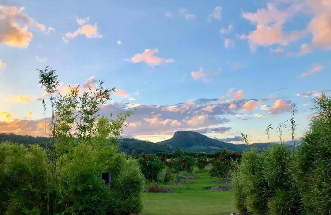 Die 2-Zimmer- Orchard Cottage - Modern Australian Sunshine Coast Holiday Cottage On Organic Farm Nr Beach bietet einen Blick auf die Berge und liegt nur ein paar Fahrminuten entfernt vom Nationalpark Noosa.